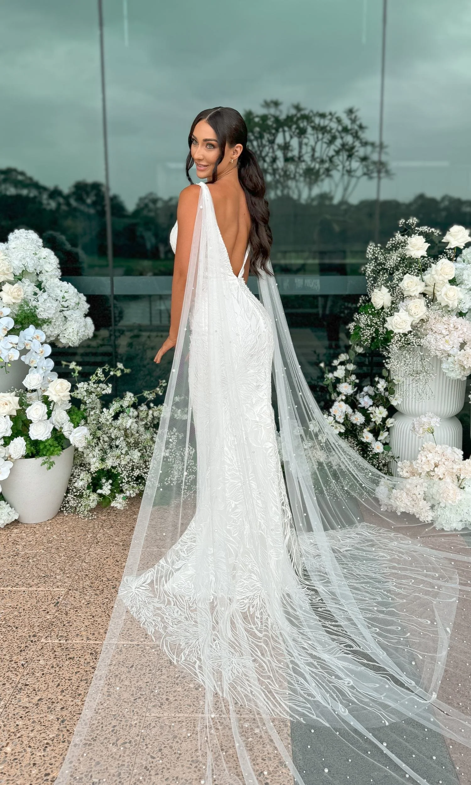 A forever kind of love. With a brand new spin on our iconic Forrest dress, Forever has been born. You are experiencing lace from top to bottom as this stunning unique lace and pearl bead work shapes your silhouette in all the right places. Forever is lined in a body contouring stretch fabric, this is the famous foundation creating the magic underneath many Rachel Rose Designs. Forever features a flattering V neckline and thin ivory pearl shoulder straps. A deep low V back with side & strap support, proving the best fit for a low back. Forever has a sheer lace train allowing the depth & art of the lace work to be on full show. Finished with a zip closing & pearl buttons. Along side Forever’s silhouette shape & luxurious bead work we have paired her with our detachable tulle & pearl ANGEL WINGS adding softness and bridal drama. They simply attach to the top of your should strap. Perfect for a bride who doesn’t want a veil. Forever is a dress that reflects your forever love.